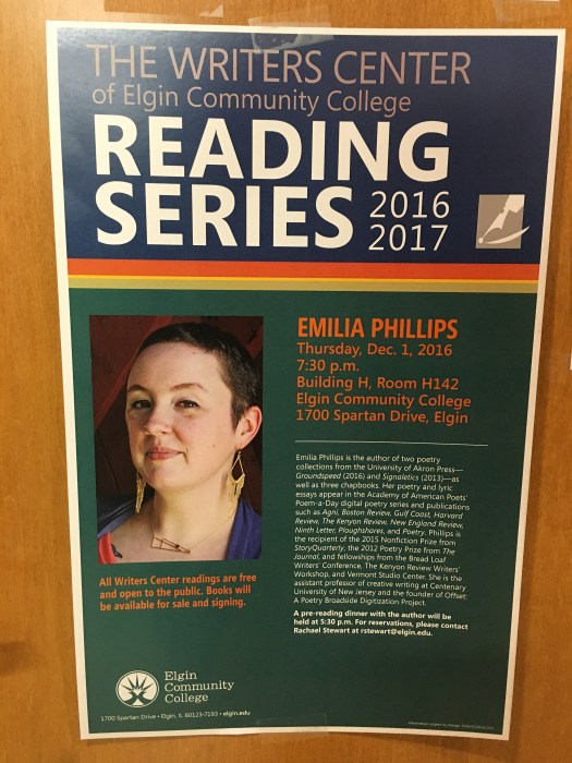 Thursday, December 1, 2016, 7:30–9:30 PM: A Reading by Emilia Phillips at The Writers Center, Elgin Community College, 142, Building H, Arts Center, Elgin, Illinois. “The Writers Center promotes and coordinates a variety of activities for area writers in all stages of development who wish to share their work in an atmosphere of constructive, respectful criticism. Current activities include the reading series which features guest authors reading from their work; the special topics series comprised of half-day workshops focused on specific writing topics; the coffeehouse providing monthly opportunities for writers to share original work; and occasional workshops with guest authors/teachers. Contact the Writers Center at 847-214-7578.”